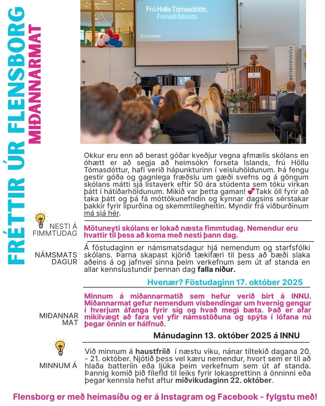 Hér má sjá fréttabréf með því helsta úr lífinu hér í Flensborg. Við vekjum sérstaklega athygli á birtingu miðannarmats í INNU en það á að gefa nemendum góða tilfinningu fyrir námsstöðunni á önninni. Þá hefur fjarvistaryfirlit einnig verið sent út en afar mikilvægt er að huga vel að mætingu og ástundun á lokasprettinum sem framundan er, eða fram að fyrstu lokaprófunum föstudaginn 5. desember nk.