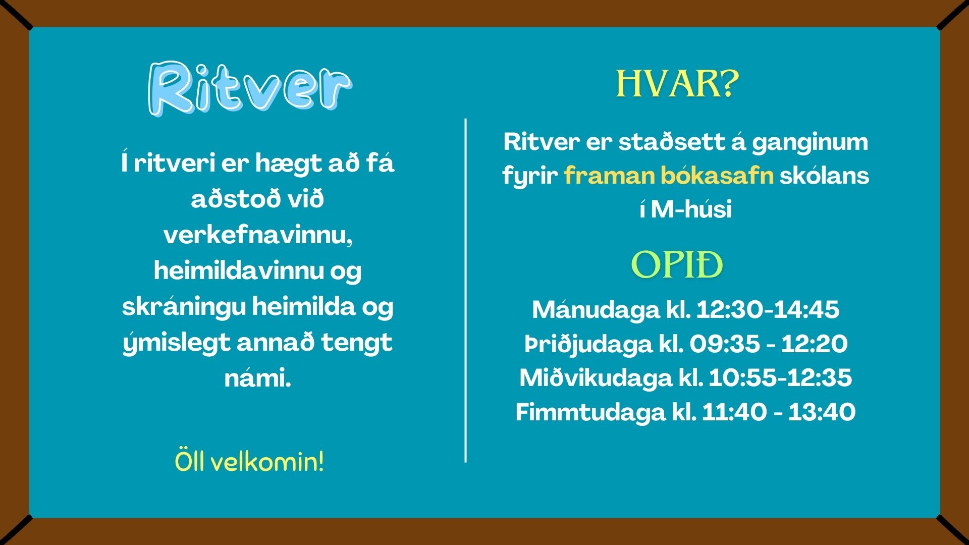 Ritverið er staðsett í hópvinnuherbergi gegnt bókasafni skólans og þar er til aðstoðar Rósa íslenskukennari.