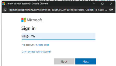 Settu NFF-netfangið þitt (kennitalanþín@nff.is) og veldu "Next"