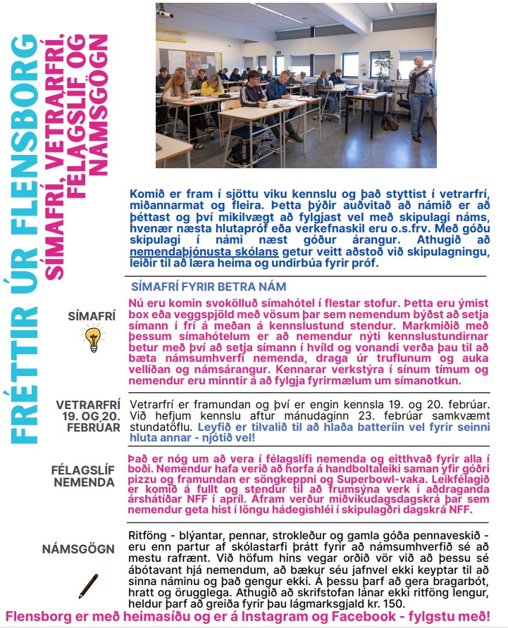 Hér má sjá nýjustu Flensborgarfréttir með helstu upplýsingum um það sem framundan er í skólastarfinu. Endilega lesið fréttabréfið vel og vandlega, þar má m.a. finna ítrekun á eftirtöldu: